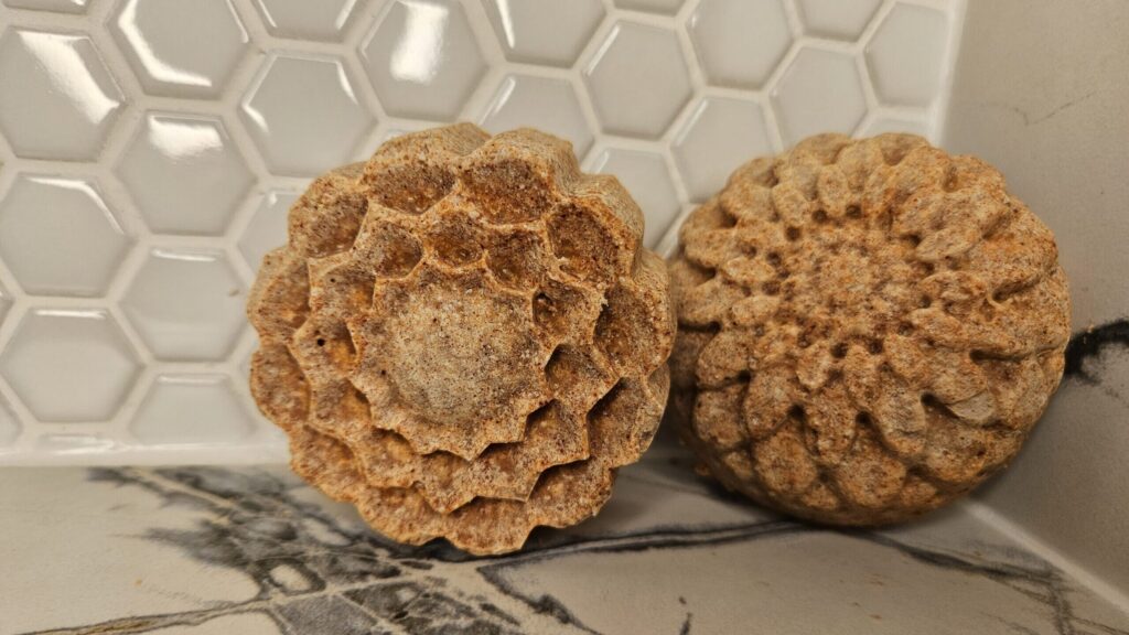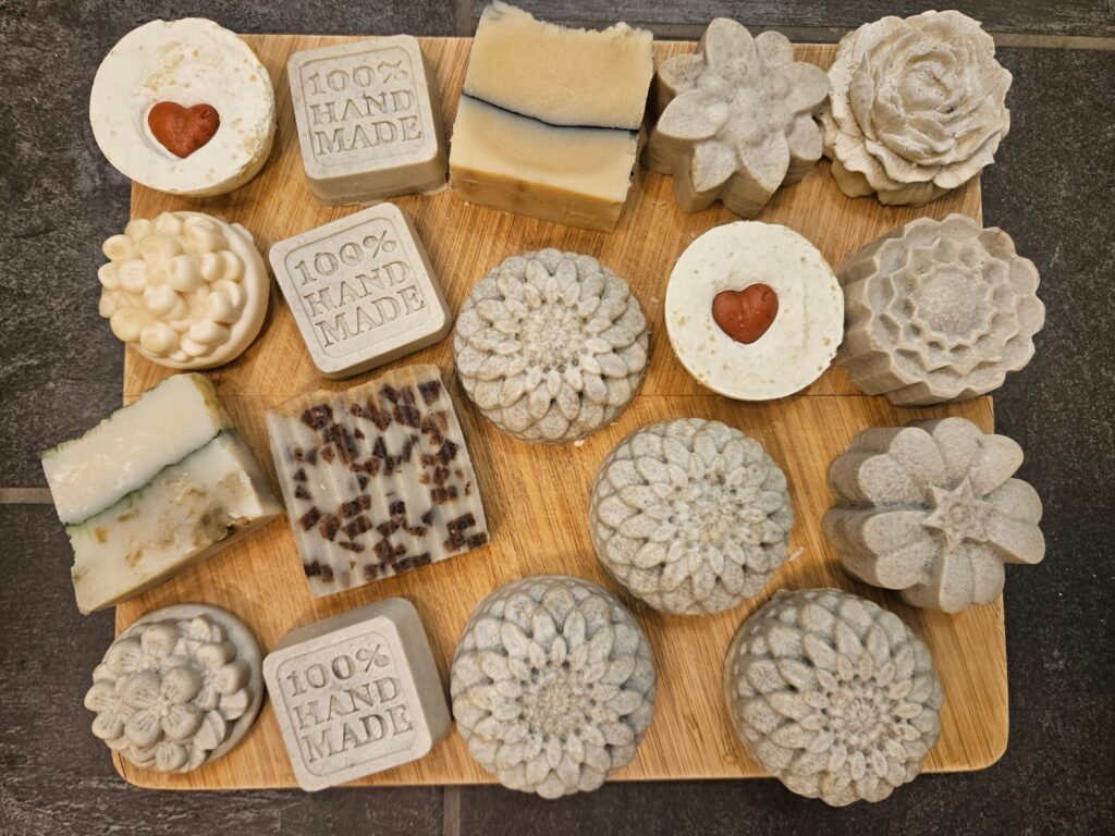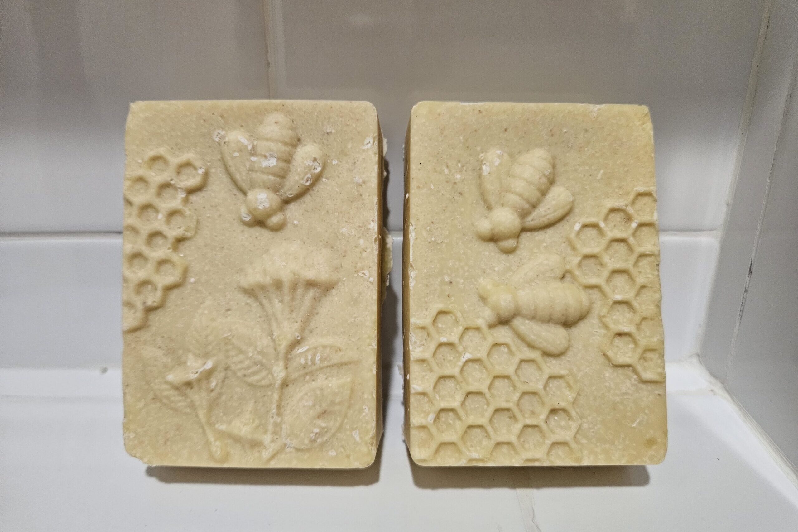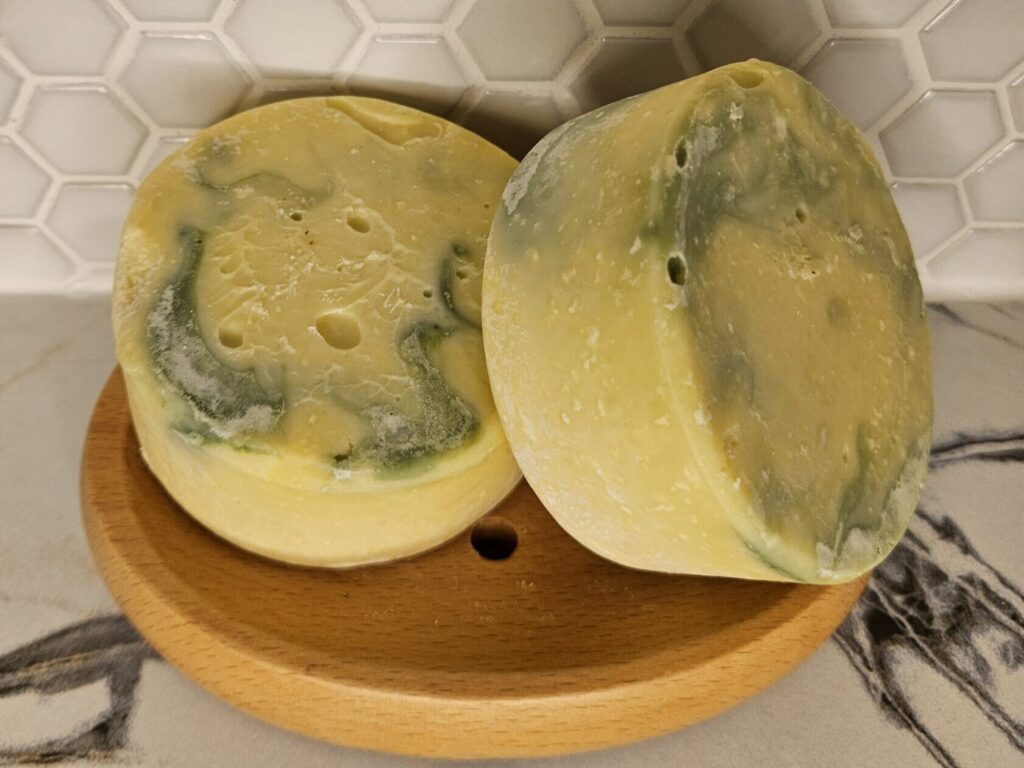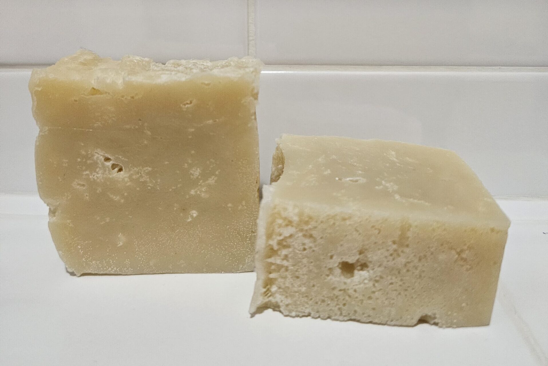 Ingredients: Coconut oil, olive oil, castor oil, shea butter, cocoa butter, sweet almond oil, nettle tea, aloe vera liquid, water, lye.